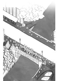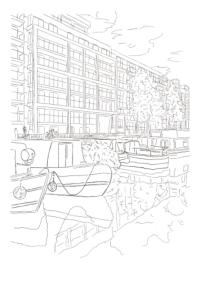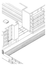 Bydelsregistrering I denne fase registrerede vi bydelen igennem isometri, skitser, fotos samt et situationssnit. Resultatet af undersøgelserne blev en A5 bog på 16 sider. Forsiden indeholdt en skitseret isometri. Fokus for registreringen var op til de individuelle grupper, og følgende emner var op til overvejelse: Materialitet/stoflighed, Rytme, Lysindfald, Formmæssige kompositioner, Overflader, Funktioner, Flow.