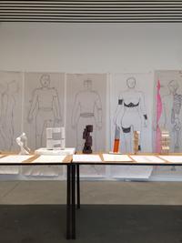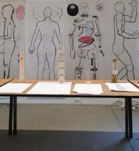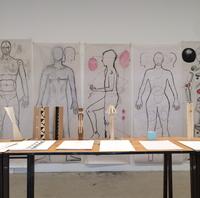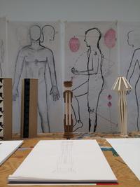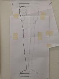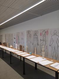 Eleverne har opmålt og tegnet deres egne kroppe, for derefter at bearbejde tegningen og udpege særlige proportioner og karaktertræk, der ligger indlejret i kroppens geometri.