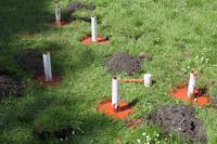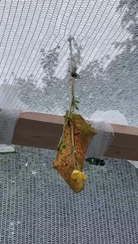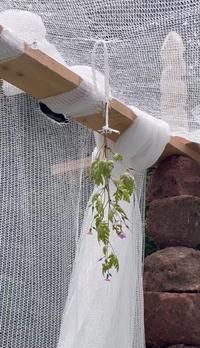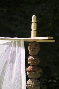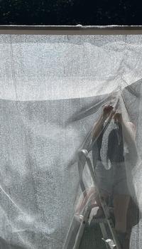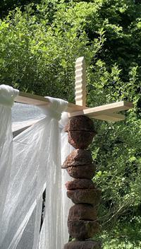 In the park surrounding the school, the students created a pavilion of coloured concrete pillar elements with a facade of draped scaffolding nets.