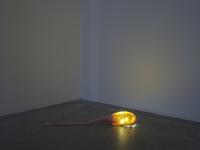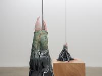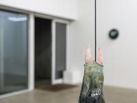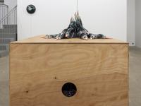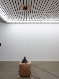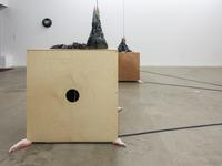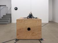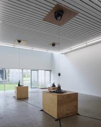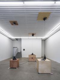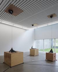Vagus means the wandering but is also the name of the longest nerve in the body. The vagus nerve touches virtually all of our internal organs and is essential for our breathing, heartbeat and voice function. The exhibition consists of a series of sculptures connected in an electrical circuit. Sounds generated by a tone generator are acoustically amplified in the boxes and propagate in leather strings connecting the lower and upper part of the sculptures. Light sensors placed in the sculptures pitch the frequency of the sounds and thus change the vibration of the rods.